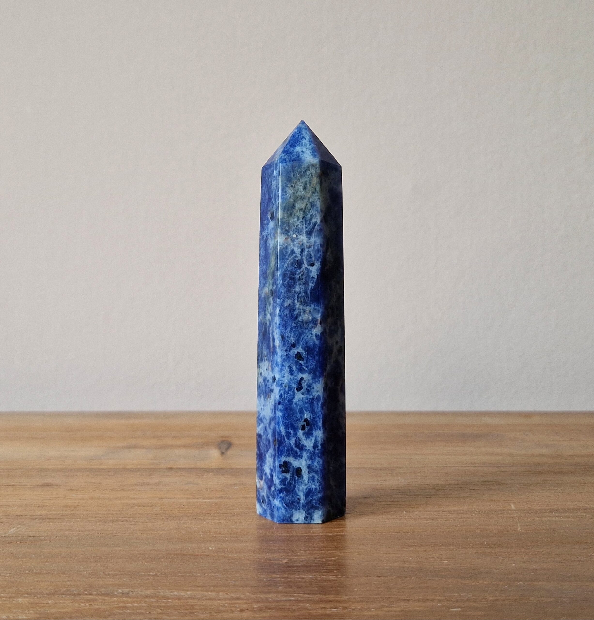 Deze prachtige Sodaliet Toren heeft een hoogte van 10 – 12 cm. Sodaliet is helpend bij het geven van inzichten, zelfliefde en persoonlijke groei. Zo is ze bevorderend voor zelfacceptatie, zelfrespect en zelfvertrouwen. Sodaliet is populair bij personen die het lastig vinden in zichzelf te geloven. Naast dat de Sodaliet prachtig in jouw interieur past wordt ze ook in therapie en meditatieruimtes geplaats vanwege haar helpende energie die patronen van gedragingen en gedachten helpt te doorbreken.